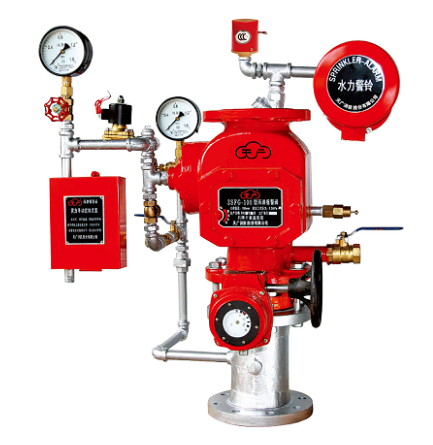 ZSFG杠杆式雨淋报警阀装置(以下简称雨淋阀装置)属于杠杆式结构,具有机械防复位功能,是国内第一个经国家固定灭火系统和耐火构件质量监督检验中心检测、符合GB5135.5-2003标准的产品,属国内首创。雨淋阀装置广泛应用于各类开式系统(系统侧管路上为开式喷头),如雨淋系统、水幕系统和水雾系统。雨淋阀装置是通过膜片室压力的降低,在供水侧压力的推动下将阀瓣打开。膜片室内压力的释放可采用多种方式,即电气引导方式、湿式引导方式和干式引导方式。