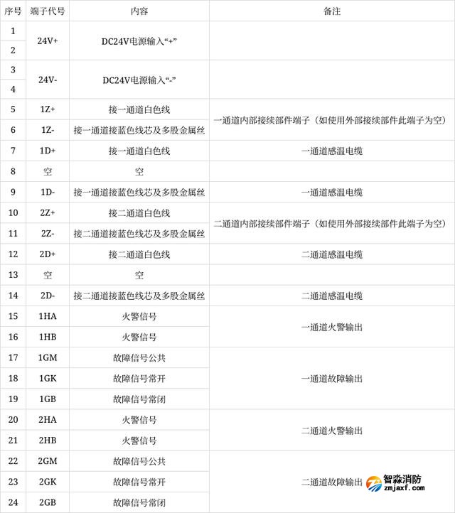按图3要求,将24V电源线、信号线从防水接头穿入盒体,接入相应的接线端子,感温线缆两端穿入微电脑处理器和终端盒上的防水接头,拧紧防水接头。一通道感温电缆白色线芯接1D+端子,蓝色线芯及金属丝接1D-端子,(如使用信号处理单元内部的接继部件,感温电缆的另一端白色线芯接在1Z+端子、蓝色线芯接1Z-端子)。二通道感温电缆白色线芯接2D+端子,蓝色线芯及金属丝接2D-端子,(如使用信号处理单元内部的接继部件感温电缆的另一端白色线芯接在2Z+端子、蓝色线芯接2Z-端子)。