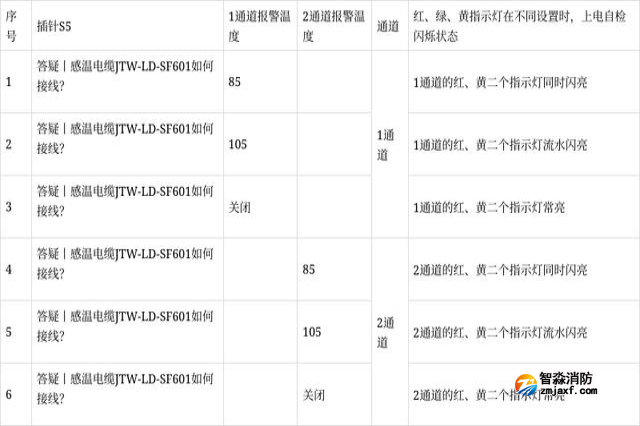 2通道报警温度设定:S5拔码开关上的5、6为2通道温度设定,5、6都在下部OFF位置时报警温度为85度、5在上部ON位置与6在下部OFF位置时报警温度为105度、5在下部OFF位置与6在上部ON位置时,2通道关闭。按要求设定好5、6后上电,按下2通道模拟火警按钮2秒后按下复位按钮,2通道红色火警灯与黄色故障灯的闪烁状态与所设置温度闪烁状态相同温度设定成功。