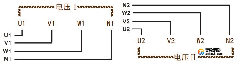 监测电压输入:电压I和电压Ⅱ:两路独立的三相四线电压输入;并接在被监测电压上,注意U、V、W、N线的顺序及极性。