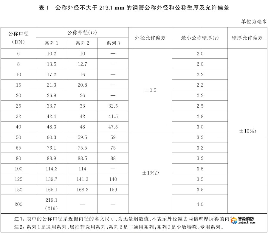 5.1.1钢管按公称外径(D)和公称壁厚(t)交货。公称外径不大于219.1mm的钢管(不含管端采用螺纹或沟槽连接的钢管),其公称外径和公称壁厚及允许偏差应符合表1的规定。