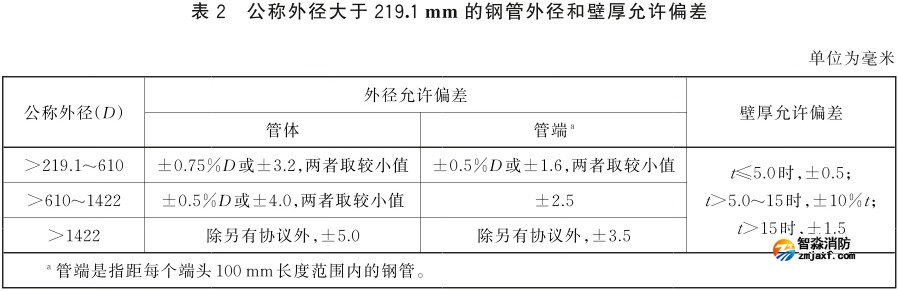 5.1.2公称外径大于219.1mm的钢管,其公称外径和公称壁厚应符合GB/T 17395的规定,公称外径和公称壁厚的允许偏差应符合表2的规定。