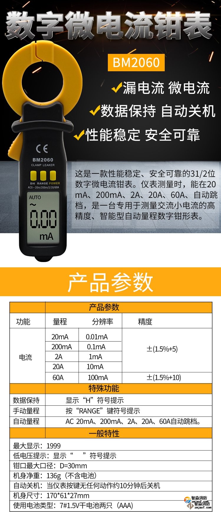 产品简介:电电流检测仪量程:0A~2A;精度:0.1mA测量电线是否漏电。最大钳口张开 : 30mm20mA/200mA/2A/20A ±1.5%±5,60A±1.5%±8五个量程自动跳档手动量程数据保持自动关机外形尺寸 :170×61×27mm重量: 约148g(含电池