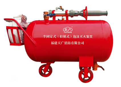半固定式(轻便式)泡沫灭火装置也叫推车式泡沫灭火装置,是新型移动式泡沫灭火装置。主要由泡沫液储罐、喷枪、比例混合器、水带、及推车手柄和底轮等构成。其操作迅速简便、可靠性强,用于扑灭甲、乙、丙类非水溶性液体火灾。该装置广泛用于市政住宅区、厂矿企业、油库、化工部门、热处理车间及加油站等场所。