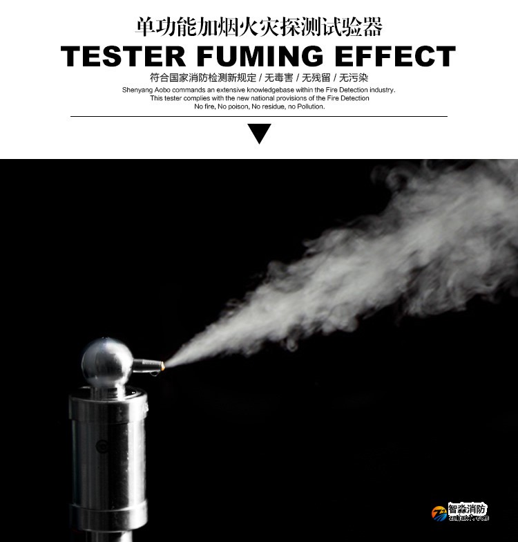 该产品由于采用特制的雾香液电子雾化技术,发出的烟雾有各种香味且绿色环保,无毒无害。根据火灾探测器倒挂在顶棚上的状况,为避免加烟后烟雾长时间滞留在火灾探测器迷宫内,特制雾香液雾化成烟后的比重大于空气比重,加烟试验后短时间内能在迷宫内快速消失,有利于提高试验工作效率。电子雾化发烟代替原有的传统的棒香加烟方式,不仅加烟方式有了进一步的升华而且烟雾中不含烟尘烟油,可避免棒香加烟所产生的烟尘烟油对火灾探测器造成二次污染。同时由于该产品采用了内部雾香液循环技术,降低雾香液的自然损耗,延长了雾香液使用时间,耗材使用成本随之减少。