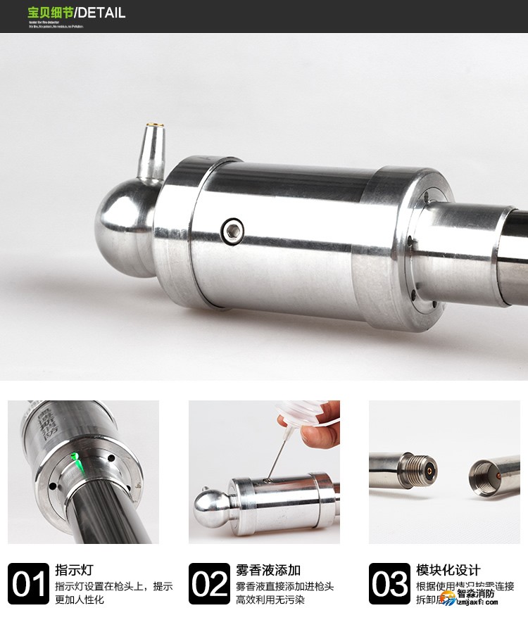 枪头、连接杆、电池杆、充电器、雾香液、注入器、简易试验笔、手报吸盘。