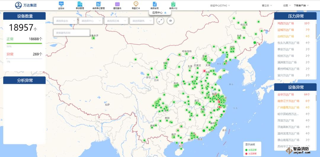 首先是巨大的中国地图,万达管理的全国所有广场、酒店、乐园等在营业的物业一览无余,绿色的点代表一切运转正常,如果出现红色则代表着某个环节出现了隐患,激活了报警。